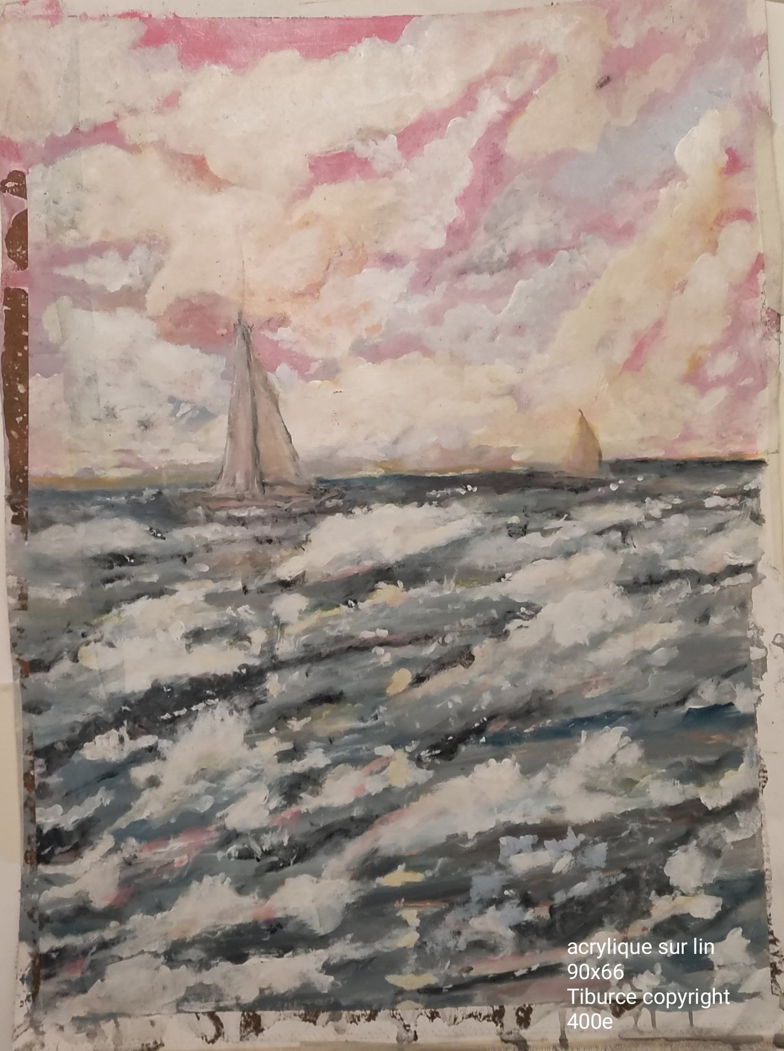 Aujourd’hui installé à Ruffec, Tiburce continue de peindre, mais son travail a évolué. Ses toiles récentes, comme Sans Titre (Sujet maritime, Voiliers et Vagues), sont des méditations sur la nature, où la mer, les voiliers et les ciels tourmentés deviennent les métaphores d’une liberté jamais tout à fait domestiquée. L’acrylique sur lin, avec ses empâtements généreux et ses harmonies chromatiques audacieuses (ces nuages roses et clairs qui contrastent avec le bleu profond des vagues), témoigne d’une sensibilité lyrique, mais aussi d’une persistance de l’esprit contestataire. Même dans l’intimité de son atelier, Tiburce reste fidèle à l’éthique des squats : l’art doit rester un espace de liberté absolue, exempt de compromis.