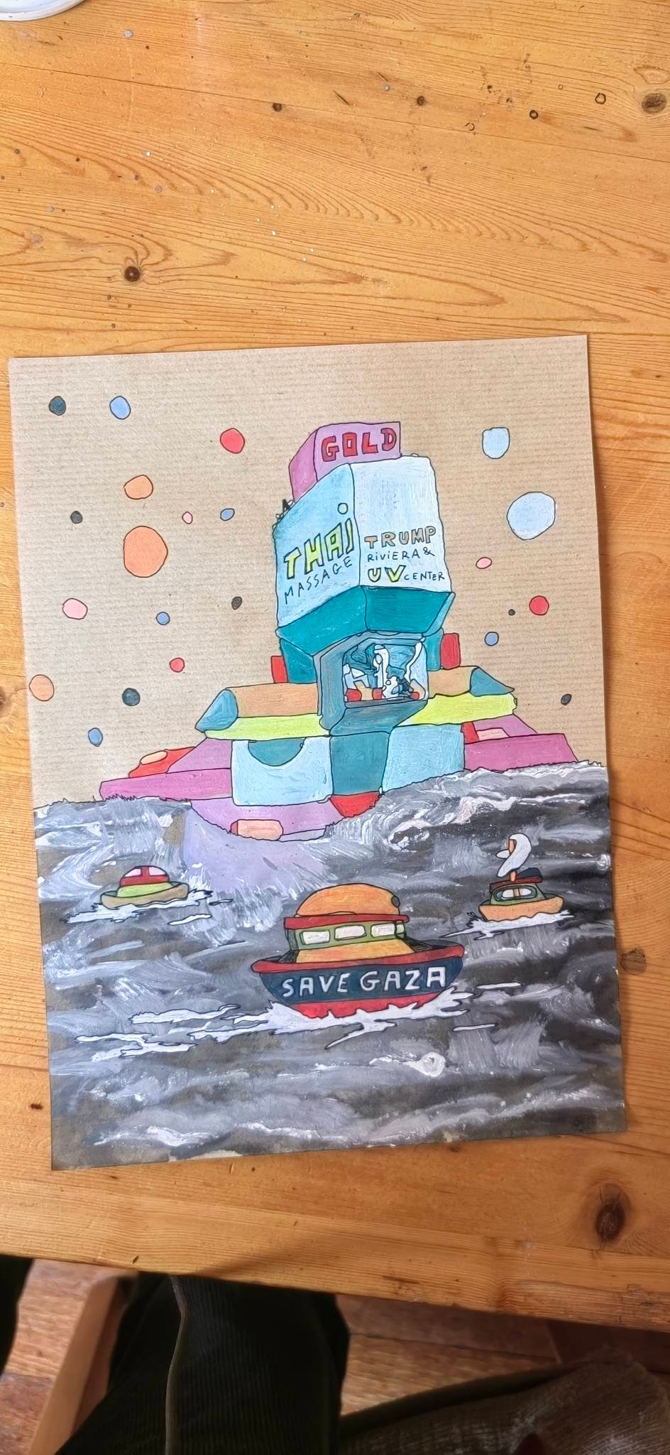 Critique sociale : L’ironie est son scalpel. Le bâtiment imaginaire « Thai Massage / Trump Riviera » devient le symbole d’une décadence consumériste, juxtaposant le luxe obscène et le tourisme de masse sur fond de crise mondiale.