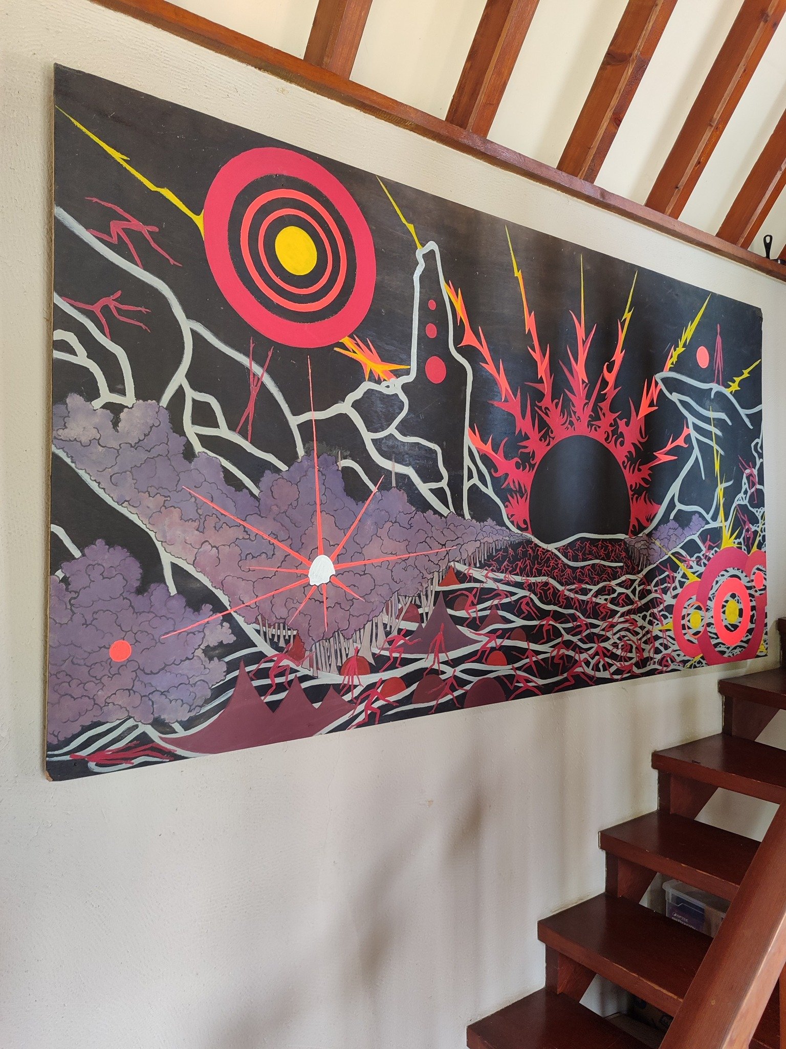 « Sous le plafond rampant d’une demeure qui semble l’étriper, cette fresque déploie un lexique formel d’une intensité rare. On y décèle l’influence souterraine d’un Robert Williams croisant le fer avec les visions cosmogoniques de la bande dessinée de science-fiction des années 70. L’espace pictural est saturé, refusant le vide au profit d’une accumulation de signes : soleils noirs, cercles concentriques évoquant des cibles spirituelles, et cette armée de silhouettes filiformes qui s’écoulent comme un magma humain.