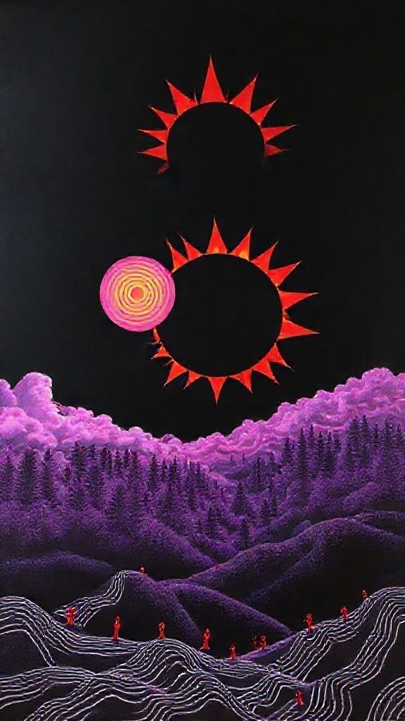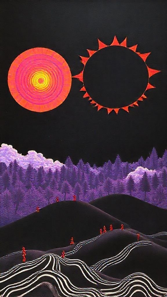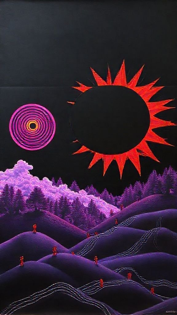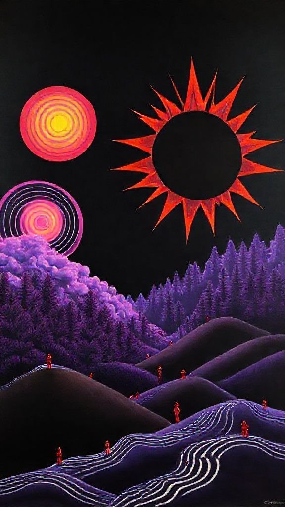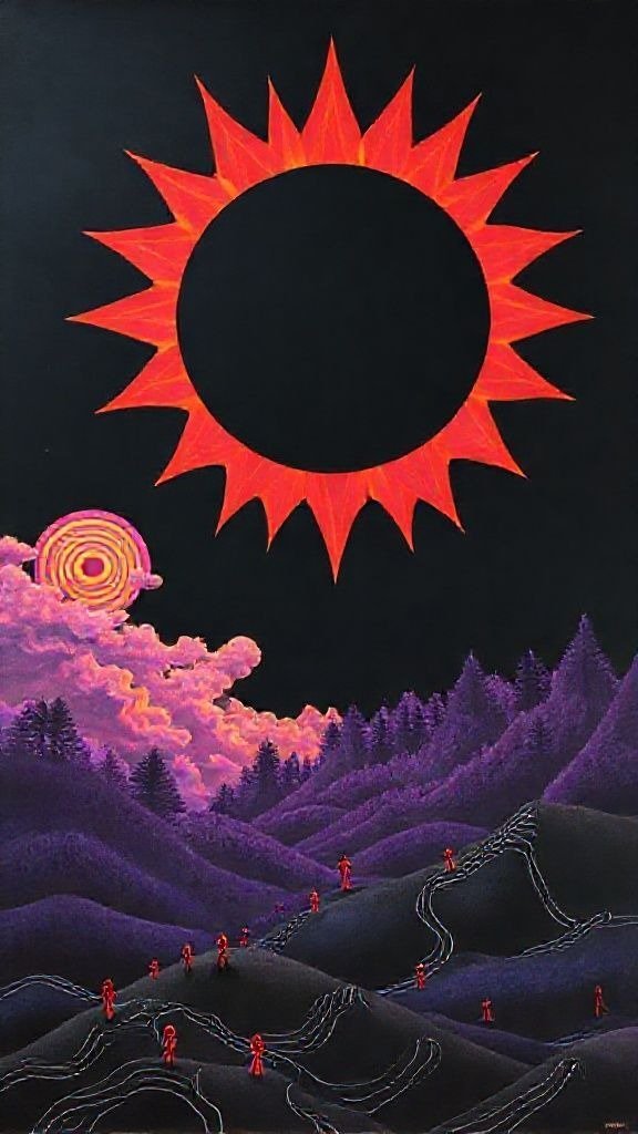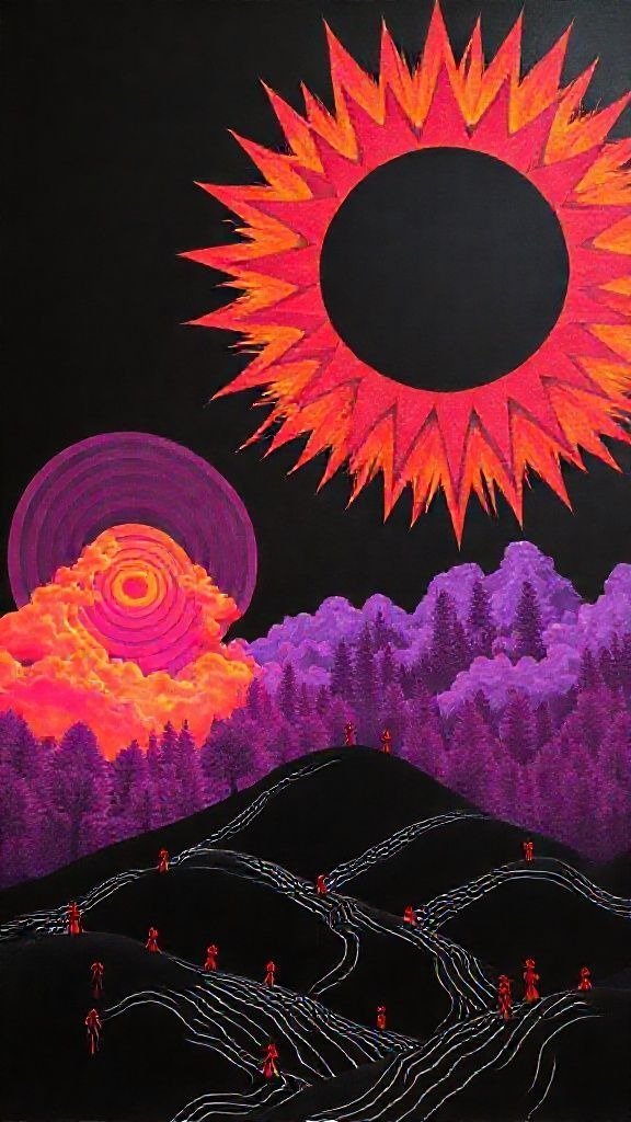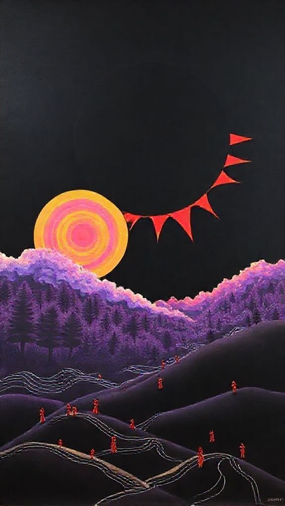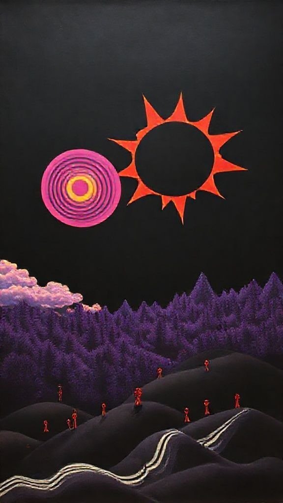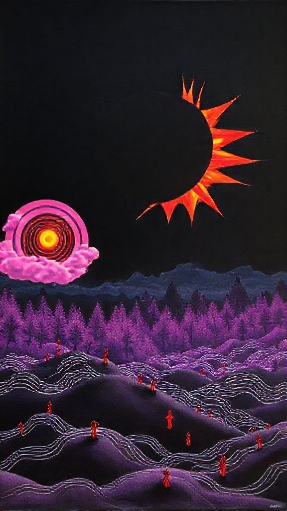 Souhaitez-vous que j’approfondisse l’analyse d’un détail spécifique de la toile, comme ces silhouettes rouges ou la symbolique des astres ?