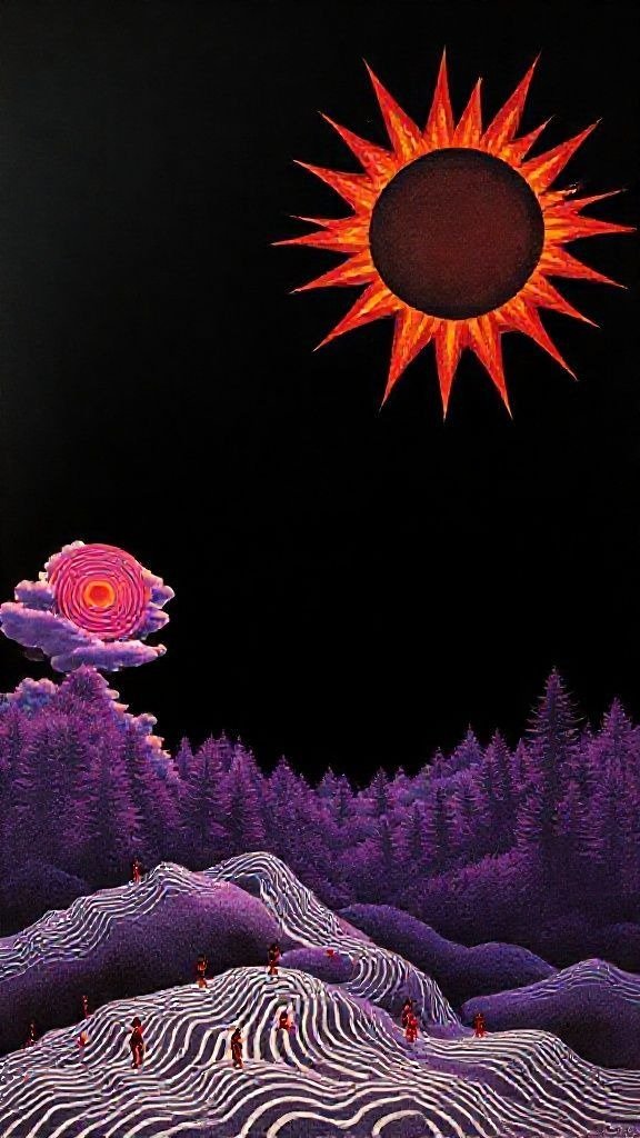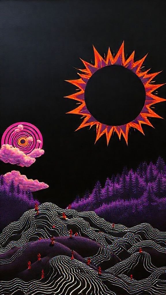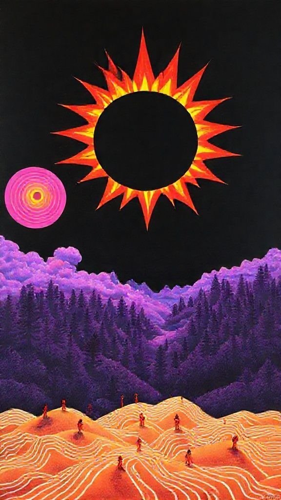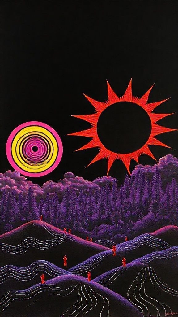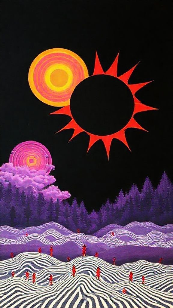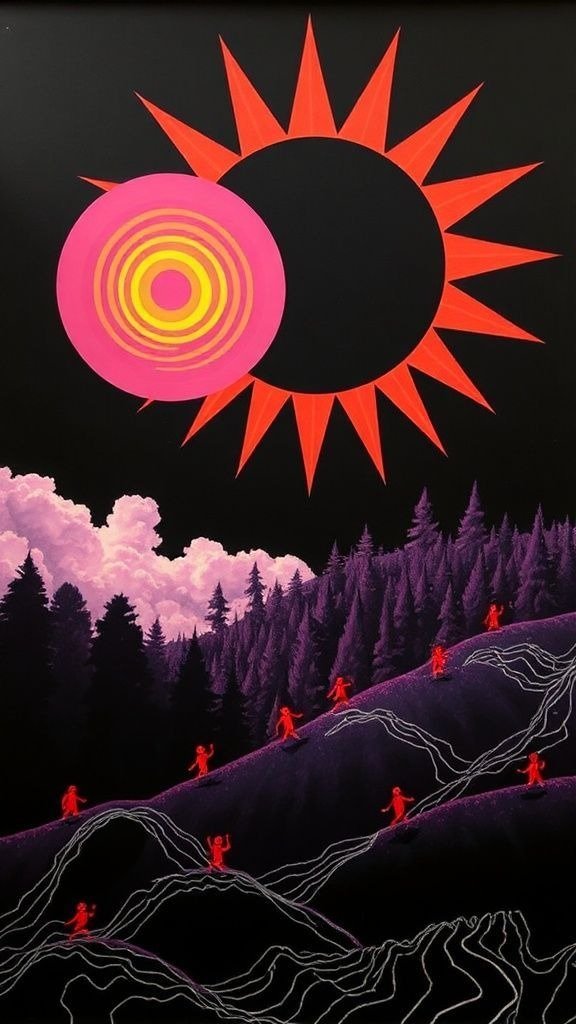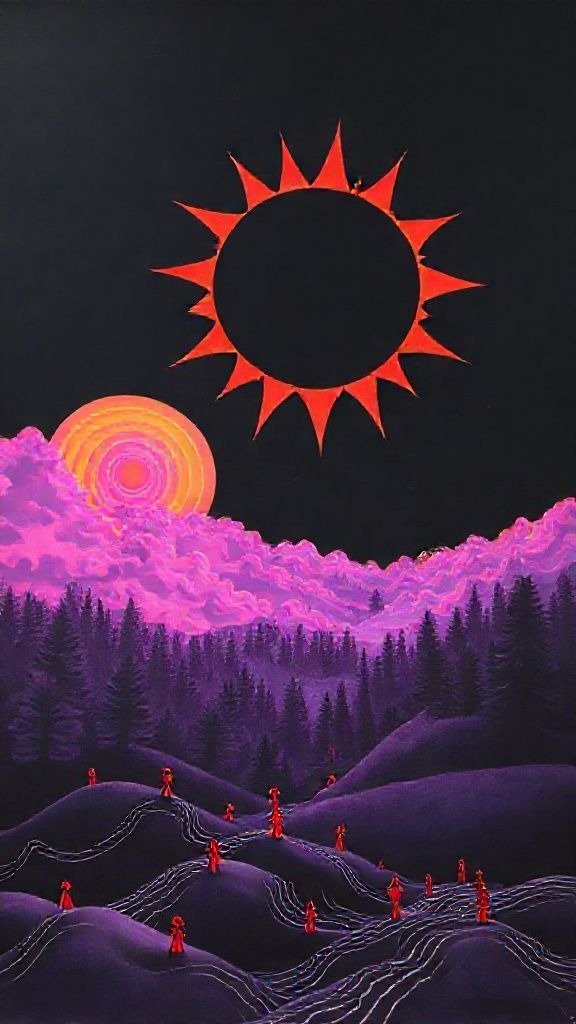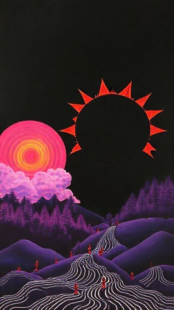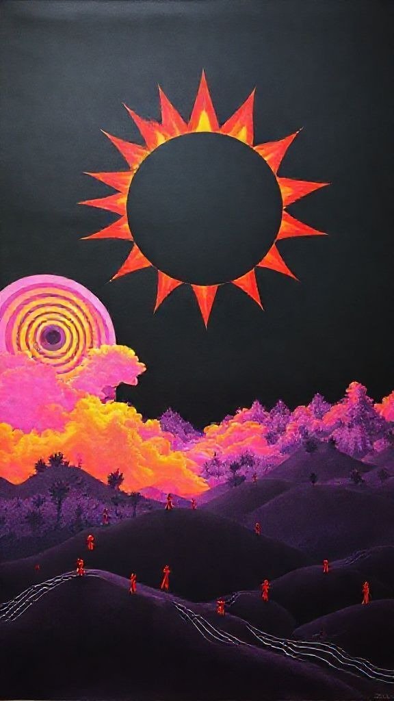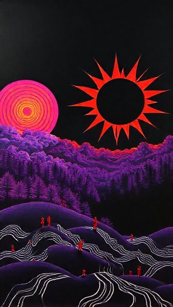 Souhaitez-vous que j’approfondisse l’analyse d’un détail spécifique de la toile, comme ces silhouettes rouges ou la symbolique des astres ?