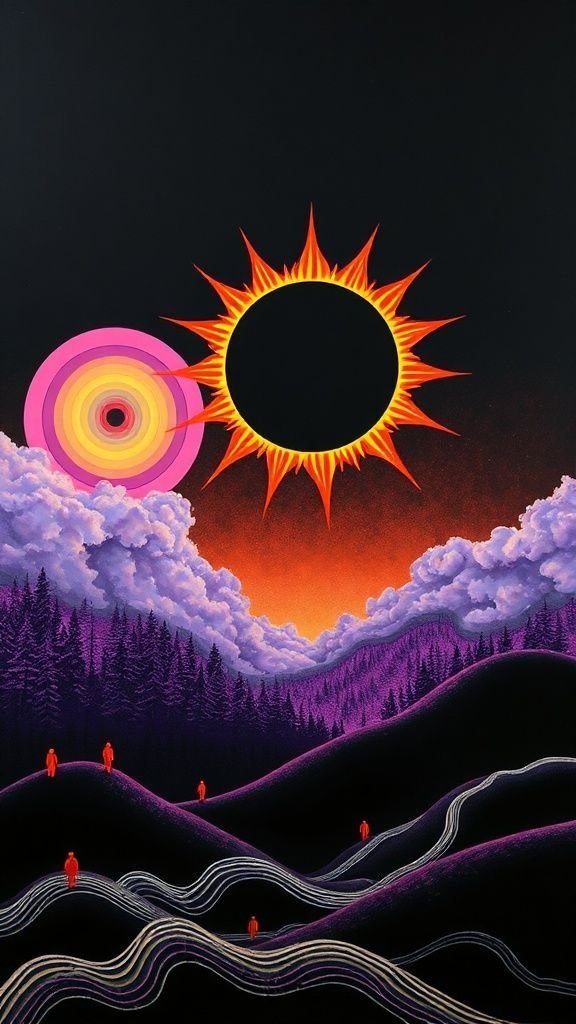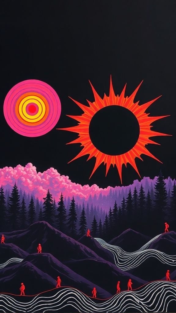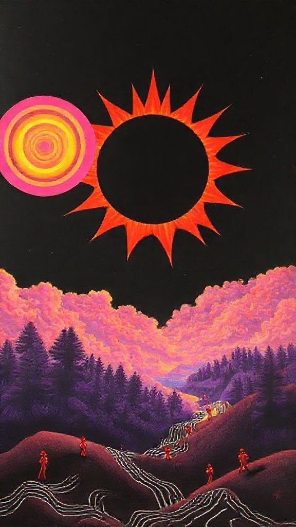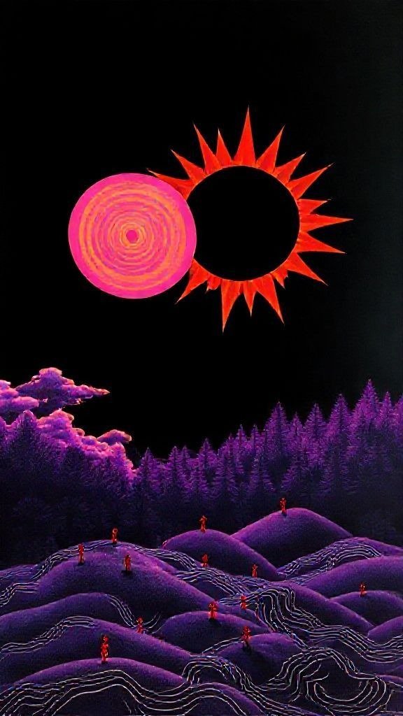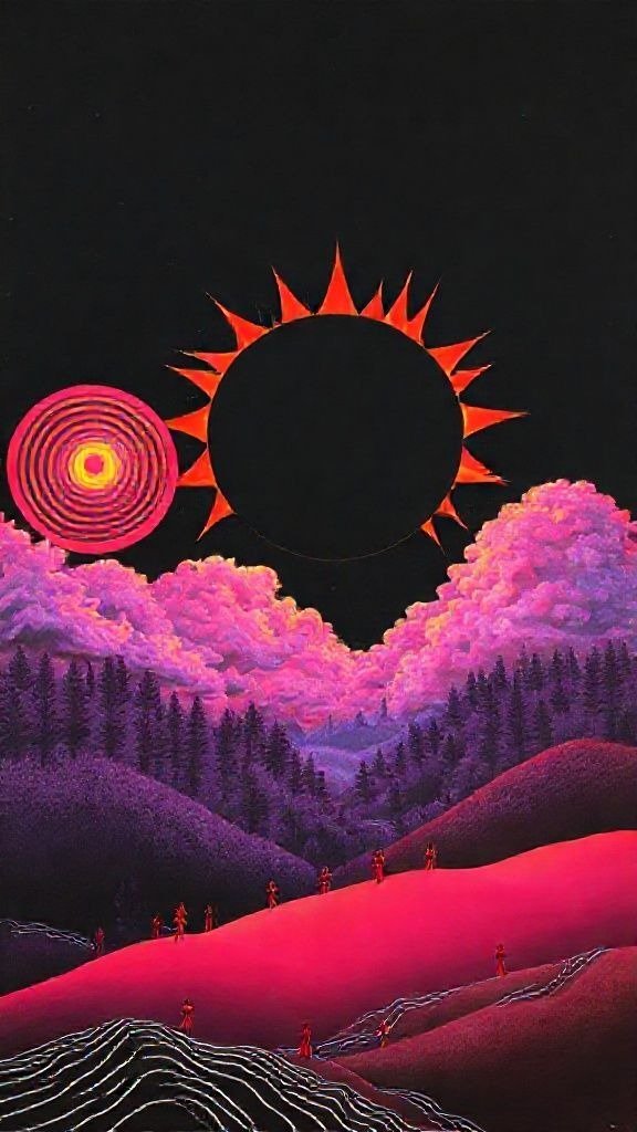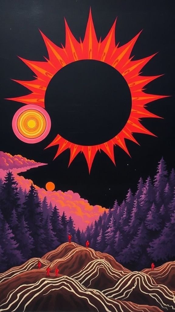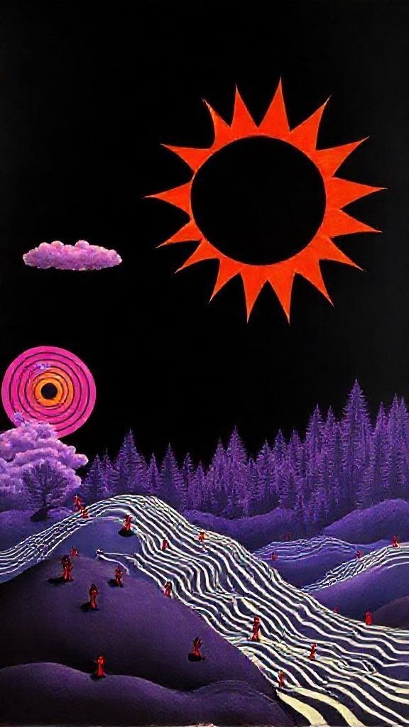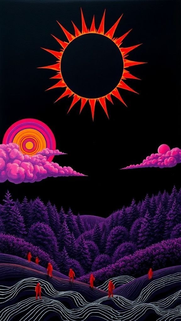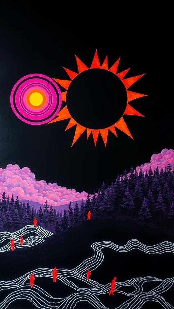 Souhaitez-vous que j’approfondisse l’analyse d’un détail spécifique de la toile, comme ces silhouettes rouges ou la symbolique des astres ?